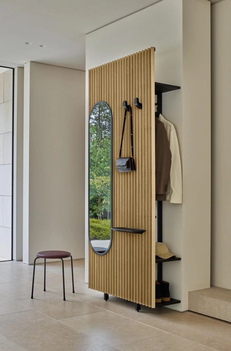 With a mirrored side, it doubles as a dressing area, allowing you to check your outfit before heading out. The combination of open shelving and hooks provides ample space for accessories and bags, keeping everything organized yet easily accessible.