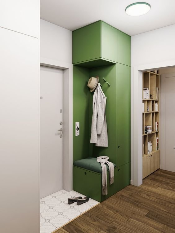 The shelves can hold shoes and bags, while hooks or a small hanging area can accommodate coats. Choosing light colors can help the corner area feel less cramped.