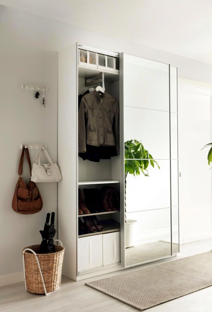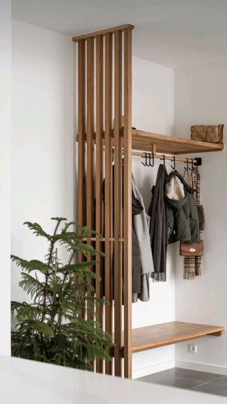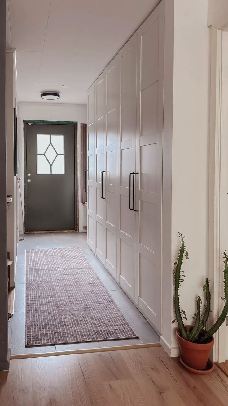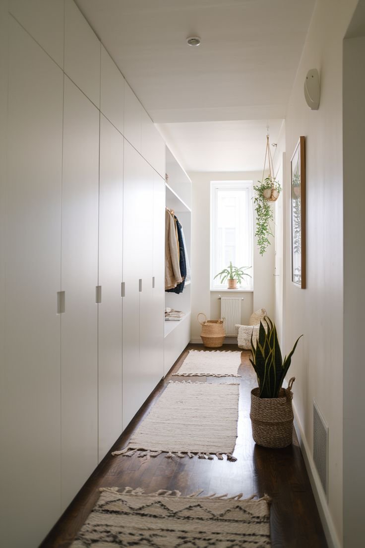 In a narrow hallway, less is more! Embrace minimalist magic with a sleek wardrobe that opens up your space and reflects your style. A few hooks and a touch of greenery can make all the difference!