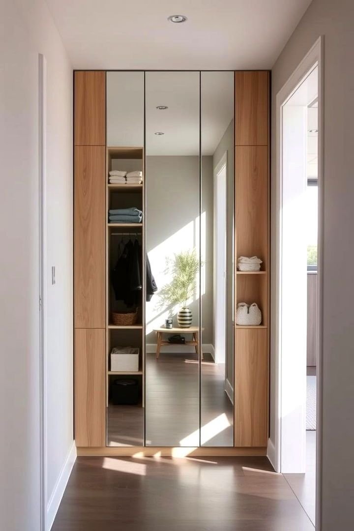 Incorporating a mirrored front not only serves a practical purpose but also reflects light, making the hallway feel larger. Consider adding a small bench below for convenience.