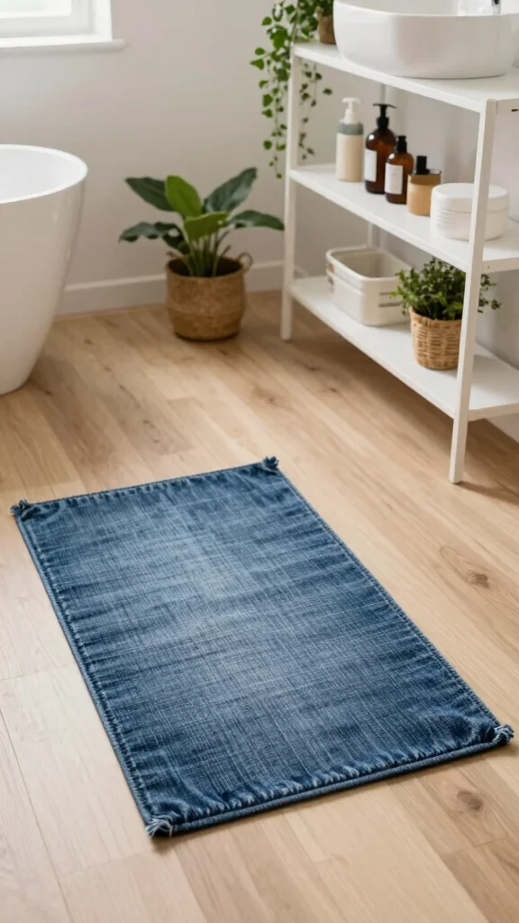 For a truly unique and eco-friendly addition, upcycled denim mats repurpose old jeans into stylish bathroom decor. These mats offer a casual, cozy vibe while showcasing sustainable practices, making them an excellent choice for environmentally conscious homeowners.