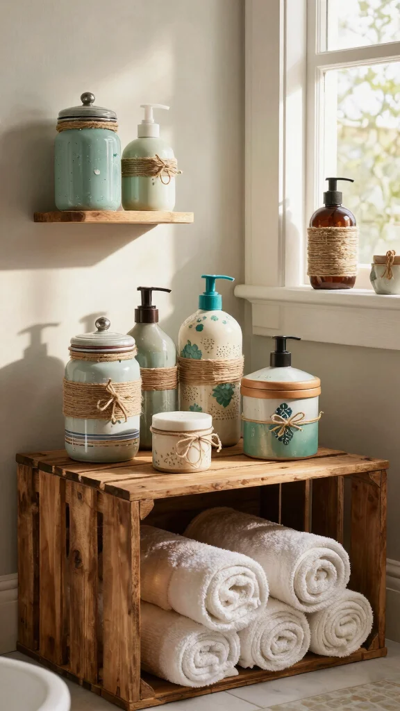 Use clear glass jars, bamboo baskets, and upcycled containers to store essentials without bulk, and keep clutter out of sight with mirrored medicine cabinets that reduce visual noise.