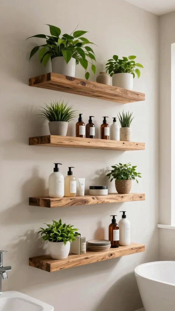 Wall-mounted shelves can hold everything from plants and toiletries to decorative accents, helping to keep your bathroom organized and visually appealing. When arranging items, vary heights and use decorative baskets to add interest and style.