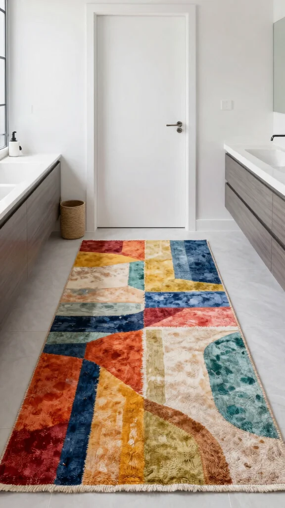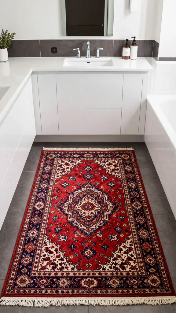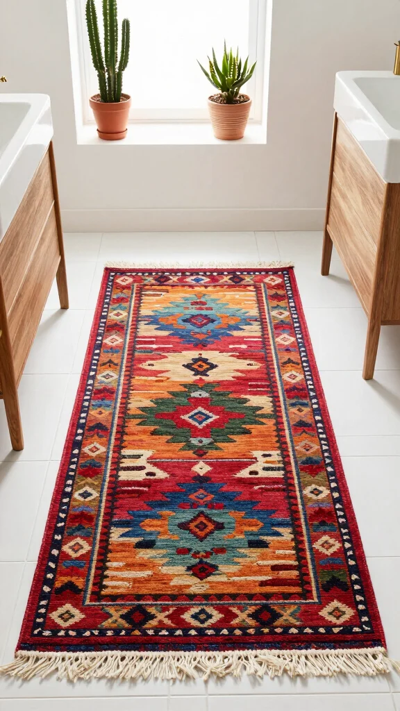 Kilim runner rugs, known for their vibrant colors and intricate patterns, can instantly energize your bathroom. These durable rugs are flat-weave, making them easy to clean and perfect for high-traffic areas. Adding a colorful Kilim runner can create a striking contrast, especially in a minimalist setup. Picture a beautifully patterned rug against simple white tiles, adding a pop of personality.