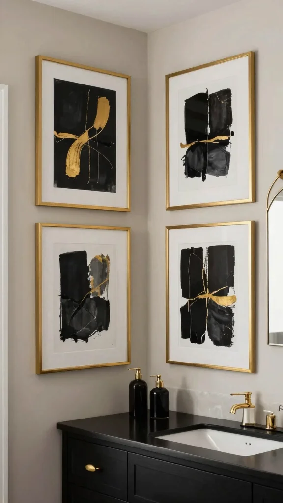 – Reflective Surfaces: Gold accented mirrors not only add elegance but also help amplify light and space in small bathrooms.