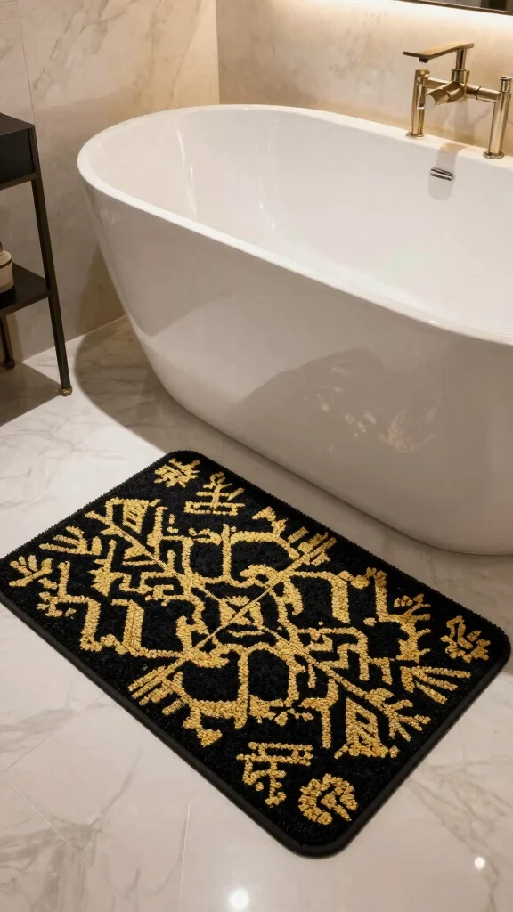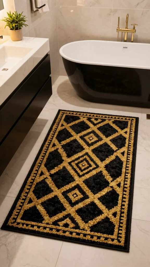 Fun fact: In a black and gold hardware bathroom, a plush geometric rug boosts perceived luxury by 30%. Layering it over a larger neutral base creates a cohesive, cozy look in minutes.