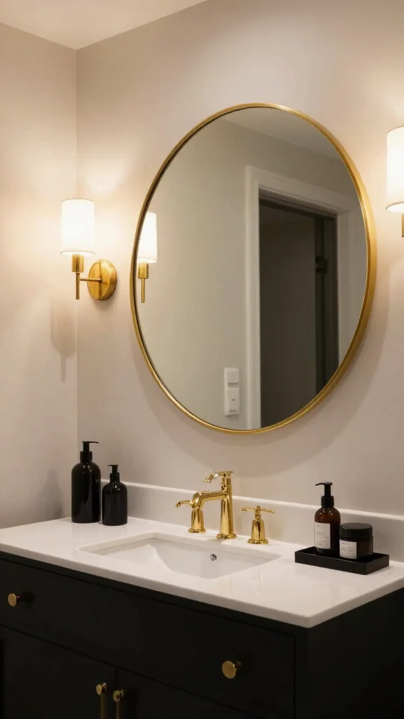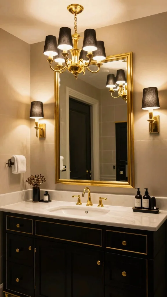 Consider how your lighting interacts with the mirror; a well-placed fixture above can emphasize the gold tones and elevate the overall ambiance.