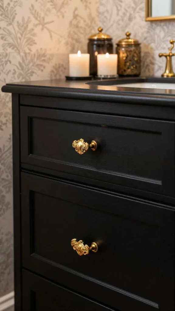 Ornate gold pulls on sleek black cabinets create a delightful surprise that enhances your bathroom’s overall design.