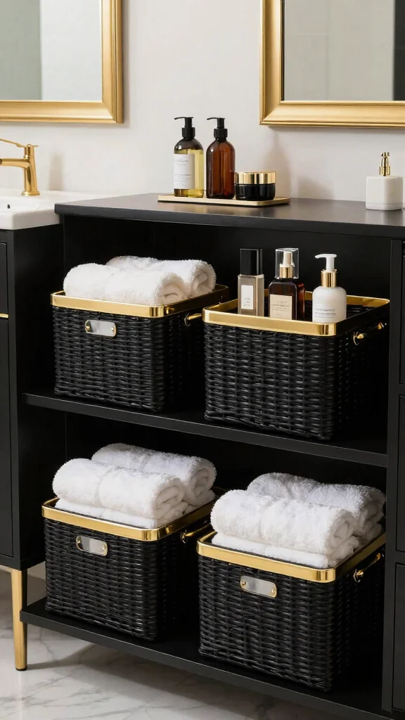Consider chic woven bins or baskets in black featuring gold accents for an elegant organizational option.