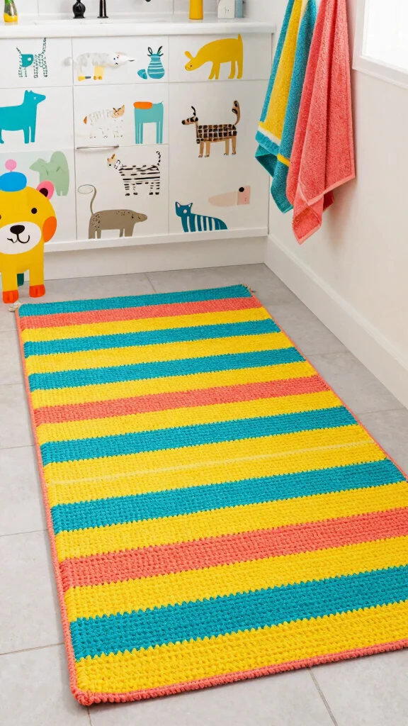 This playful design is perfect for children’s bathrooms or for anyone looking to add a fun touch to their sanctuary. You can also experiment with different yarn textures within the stripes for added visual interest.