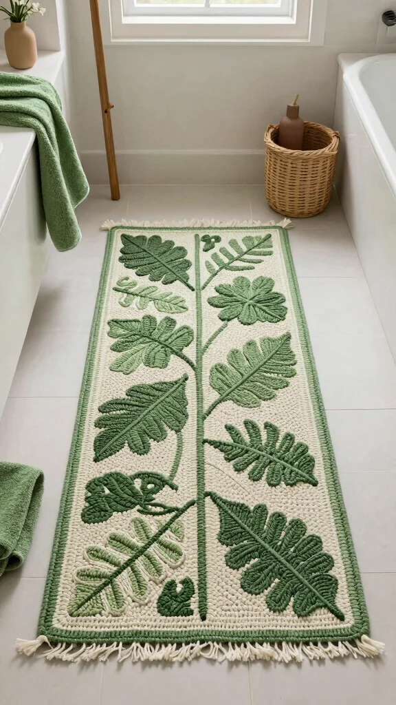 Nature-inspired crochet rug motifs bring the tranquility of the outdoors into your bathroom. Designs featuring leaves, flowers, and earthy tones create a serene sanctuary that feels fresh and vibrant. Using greens, browns, and soft floral hues enhances your space and promotes a sense of calm.