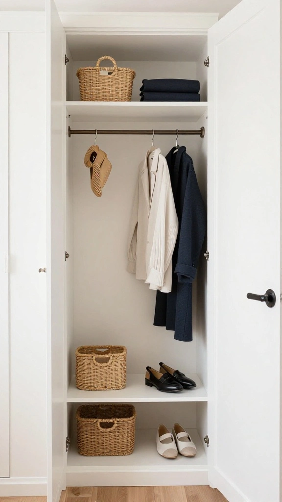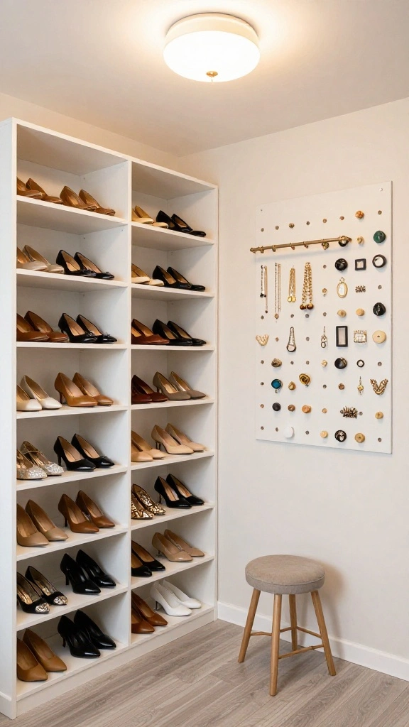 To make the most of vertical storage, think about using clear bins for seasonal items on higher shelves. Hang hooks for bags or hats at varying heights for an artistic touch. A pegboard wall can keep your jewelry and accessories organized and within easy reach.