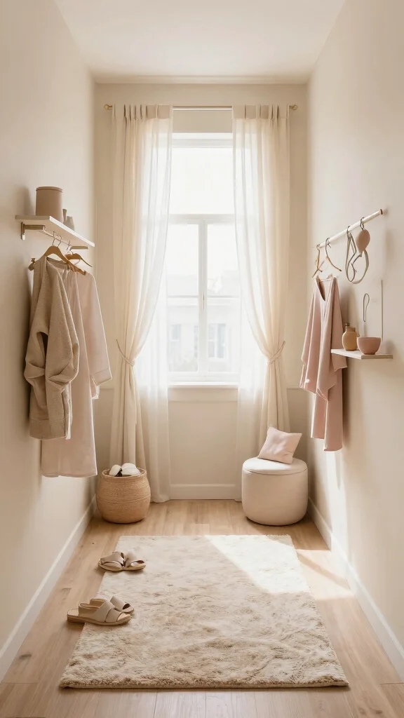 Less truly is more in a narrow dressing room! Adopting a minimalistic approach fosters a clean, uncluttered environment. By focusing on essential items and limiting decorative pieces, you enhance both the beauty and functionality of the space.
