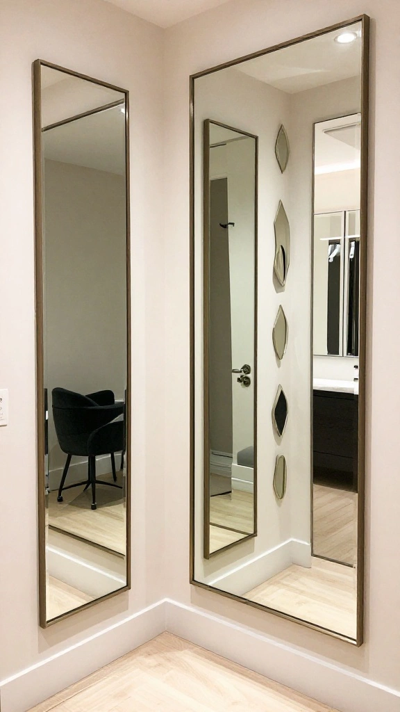 Consider hanging a full-length mirror on the door to maximize utility and visual appeal. Use mirrored trays for jewelry to keep things organized and stylish. A gallery wall of different-shaped mirrors can add a unique design element.