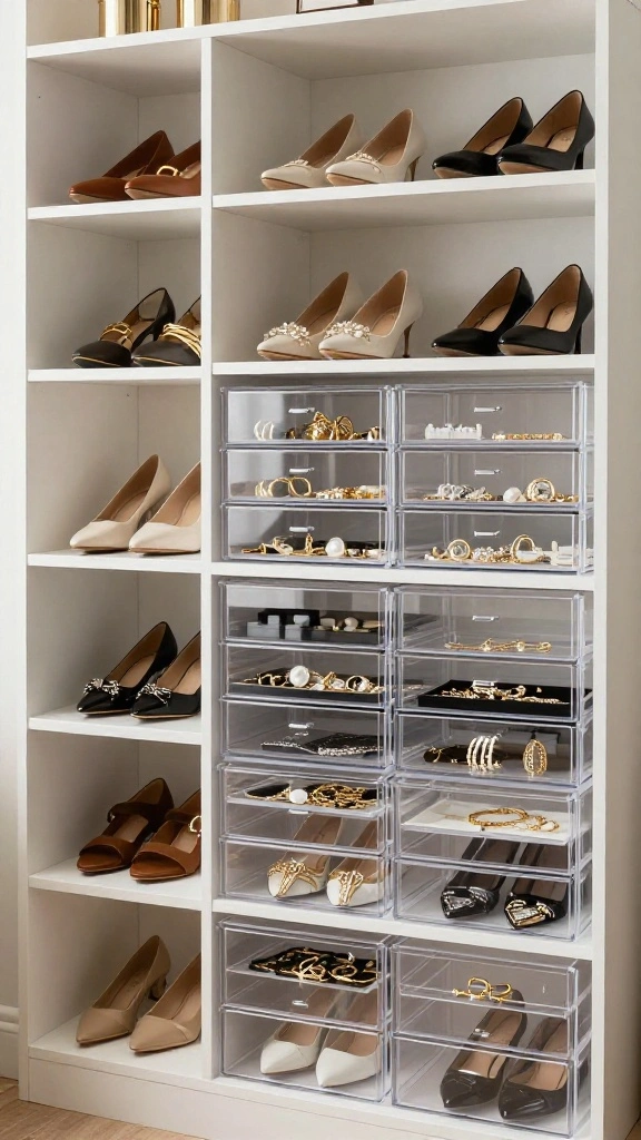 Consider using clear bins for shoes, bags, or accessories, and acrylic drawers to showcase your jewelry collection while keeping it tidy.