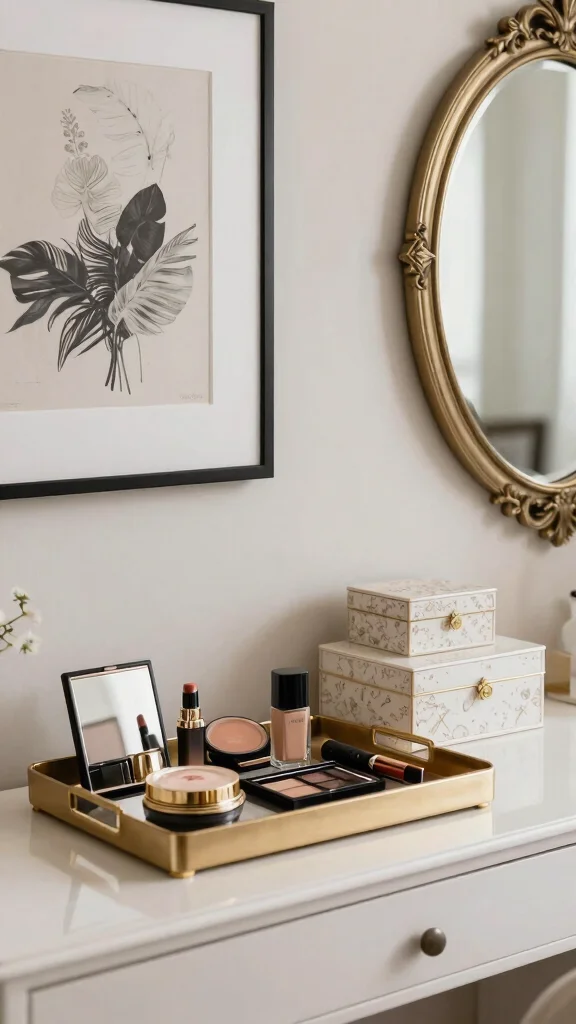 Use a stylish tray to organize your makeup or accessories, and choose interesting boxes to store small items while adding color. A unique piece of art or a decorative mirror can become a captivating focal point.