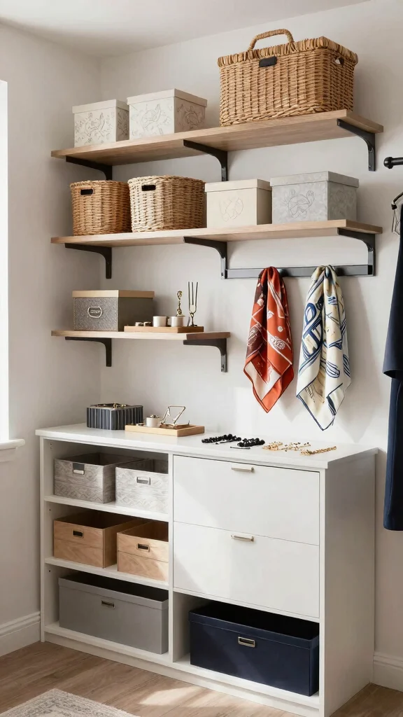 Consider using floating shelves to utilize vertical space effectively, or opt for clear bins to keep items visible yet contained. A curated display area allows you to showcase accessories and add a personal touch.