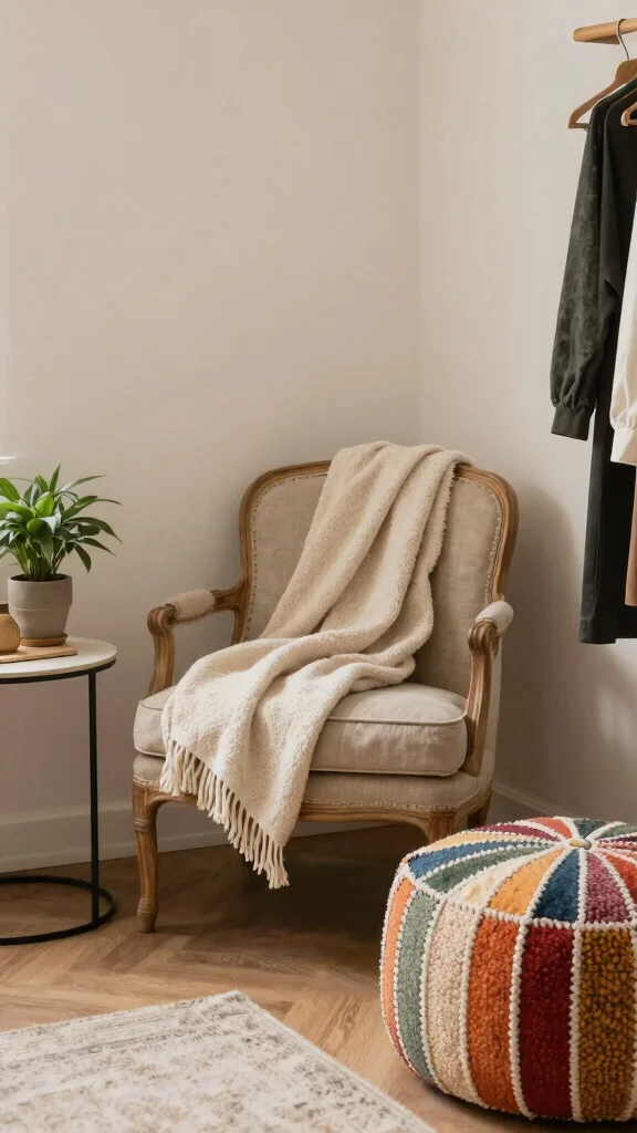 Consider a vintage armchair paired with a soft throw for a warm and inviting vibe. A fun-colored pouf can add a playful element, while a small side table can hold your favorite accessories or a cup of tea.