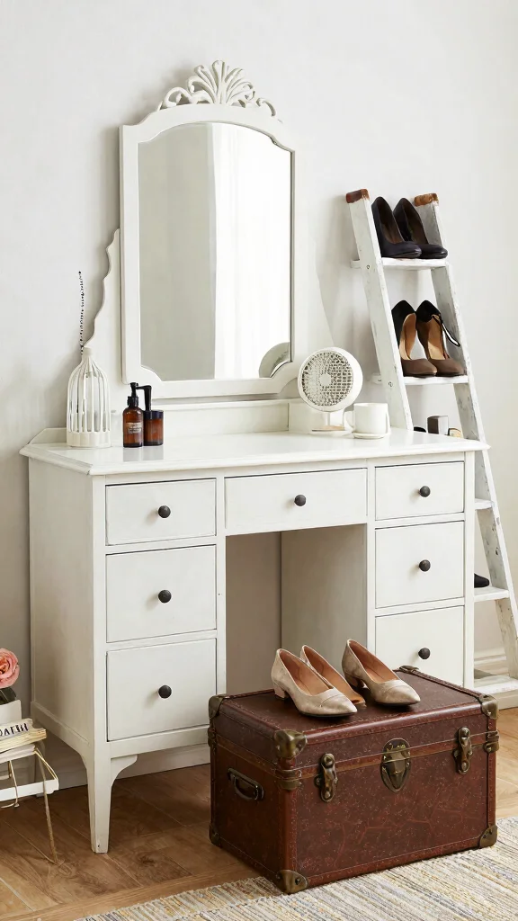 Get creative: turn a ladder into a unique shoe rack, or use an old dresser as a storage unit paired with a mirror. Refurbishing an antique trunk can provide both storage and a fashionable seating option.