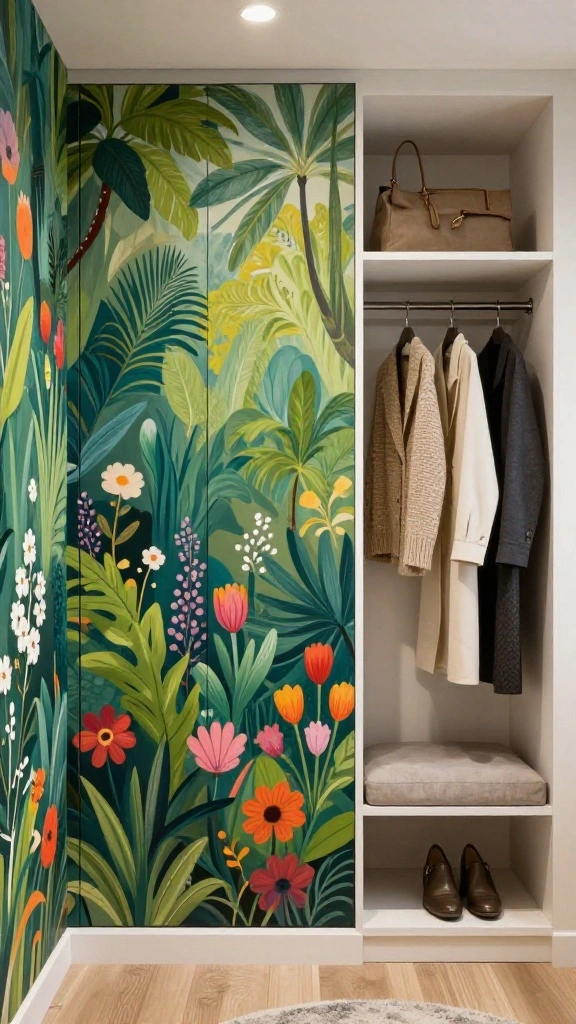 Artistic wall murals combine functionality with striking design, turning your dressing room into an inspiring space.