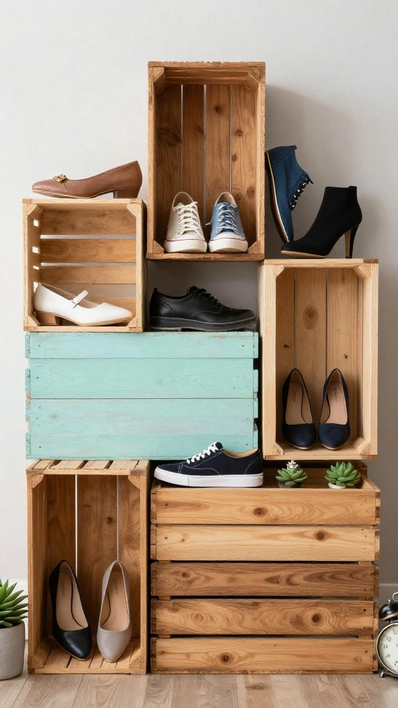 These crates not only provide excellent organization but also promote sustainability by repurposing materials. Position your favorite shoes prominently to admire, while seasonal pairs can be tucked away neatly.