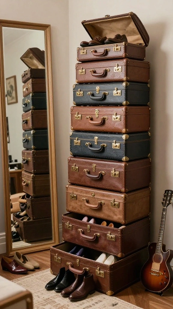 Look for suitcases made from sustainable materials to align with eco-friendly practices. This approach not only enhances your decor but also helps keep your shoes organized and out of sight.