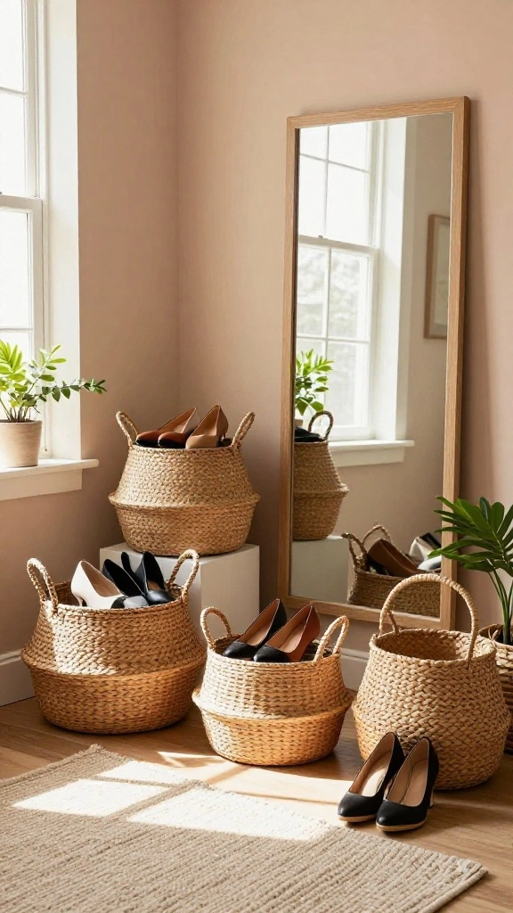 Baskets serve as both a stylish and practical way to store shoes in your dressing room. Opt for natural materials like seagrass or jute to create a relaxed, bohemian vibe that adds warmth to your decor. Place them under benches, on shelves, or on the floor to keep your footwear organized and readily accessible.