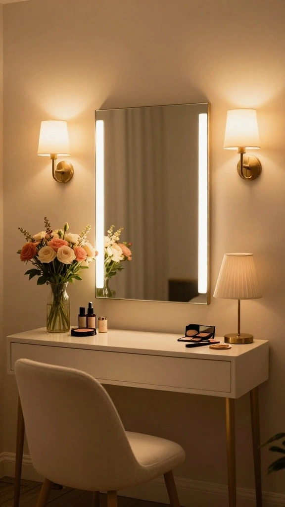 Lighting is vital for your vanity, shaping both the ambiance and your makeup routine. By combining soft, ambient lighting with focused task lights, you create a cozy yet practical space. Wall-mounted sconces or LED lights around your mirror can provide the perfect brightness for flawless makeup application. This balanced approach not only enhances functionality but also sets a welcoming mood.
