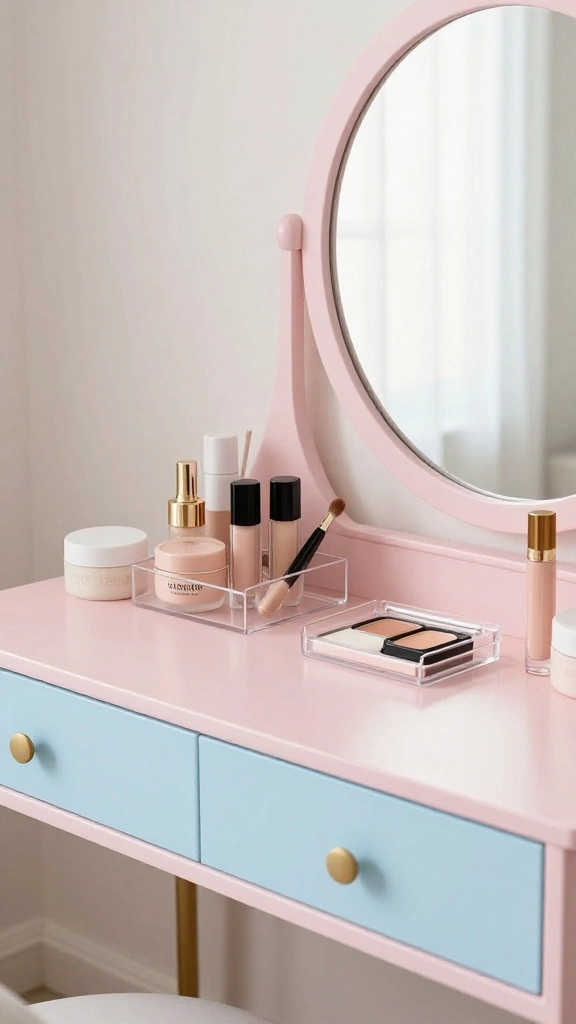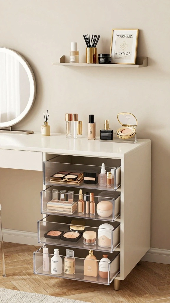 An organized vanity streamlines your morning routine, making it more enjoyable and efficient. Investing in stylish makeup storage solutions not only keeps your space clutter-free but also enhances its visual appeal. Clear acrylic drawers or tiered organizers can maximize space while maintaining a chic look.