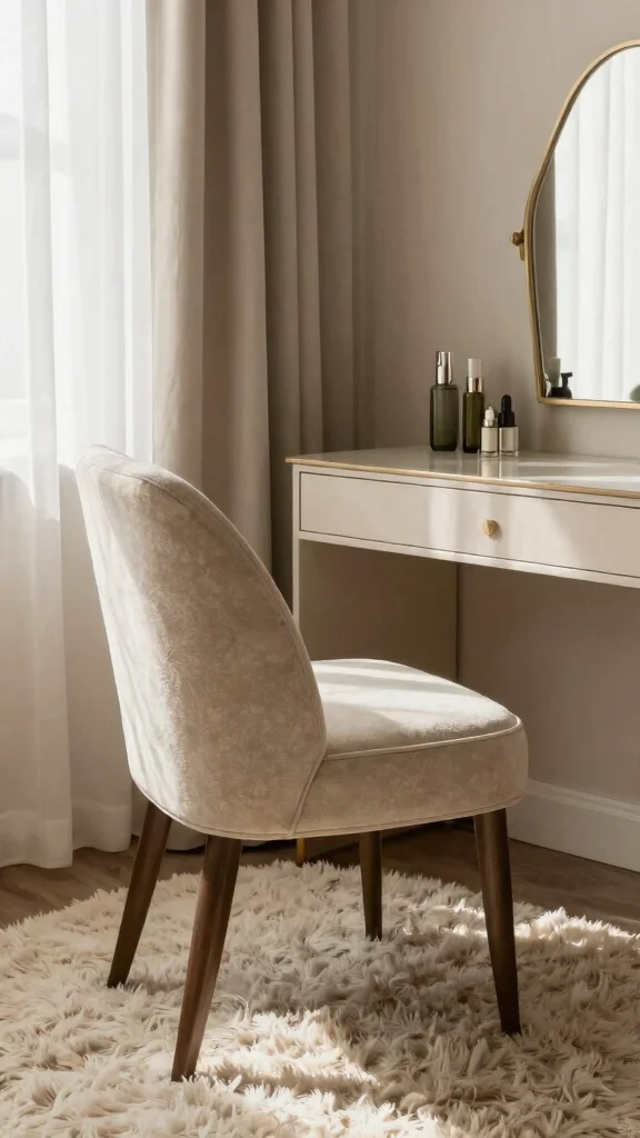 – Pair with soft textures like a plush vanity chair.