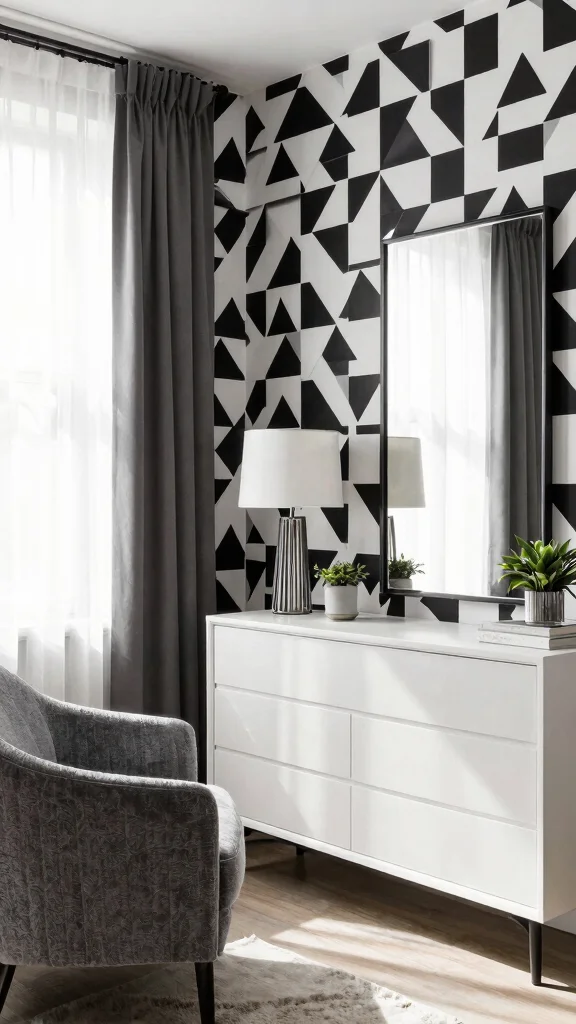 Bold geometric patterns in your dressing room wallpaper ideas turn a routine morning into a studio-worthy moment. Start with a large-scale black-and-white print for drama, then layer with colorful accents to keep energy high and inviting.