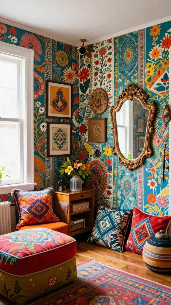These dressing room wallpaper ideas aren’t just decor; they’re a mood. Bohemian eclectic designs invite you to mix prints and textures, turning a simple room into a personal retreat.