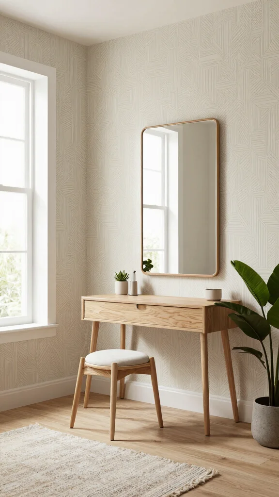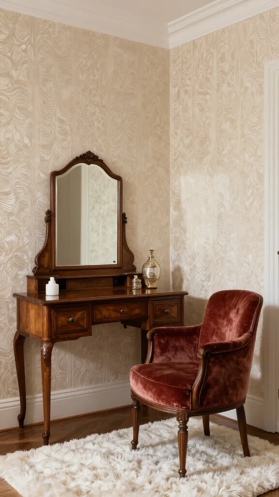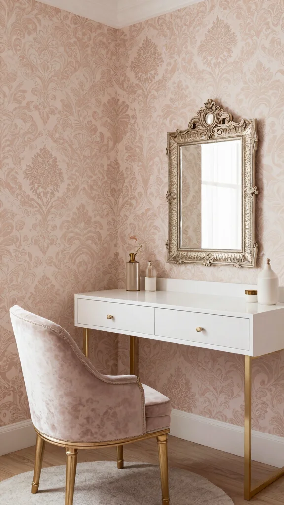 To enhance this luxe look, focus on layering textures throughout your room. Combine your wallpaper with budget-friendly decor options like a cozy throw or a tactile rug to create a complete aesthetic. Let the natural light play off the textures to add depth and warmth, making your dressing room feel inviting and stylish.