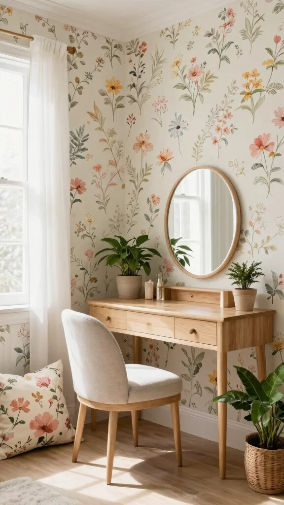 Whimsical floral prints are the secret weapon for dressing room wallpaper ideas—they make the space feel fresh and inviting. When you pair soft watercolor florals with light fabrics and rustic wood, guests instantly relax and say, ‘this place feels like home.’
