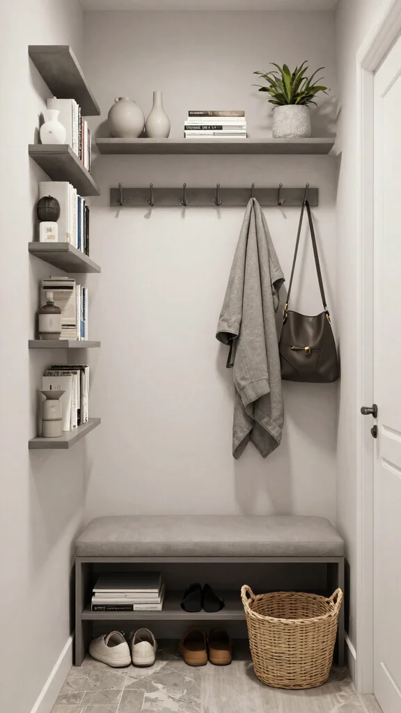 In a narrow hall, every inch counts. Start with a slim console or wall-mounted shelf to create a drop zone without crowding floor space. Use vertical storage like coat hooks, slim wall baskets, and floating shelves to keep essentials within reach. Choose a compact storage bench with hidden bins to hide shoes and keys. Focus on functional hallway storage solutions like a slim console with baskets or wall-mounted cubbies to maximize organization. Select light, translucent storage to keep the space feeling open, and keep surfaces clear to preserve the sense of flow in small space decorating.