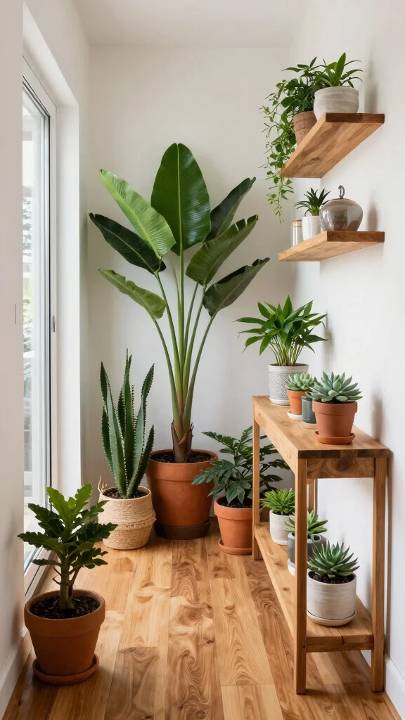 To effectively incorporate natural elements, consider these strategies: Use tall plants in corners to liven up the area. Wooden shelves can add a rustic touch while offering display space. Woven baskets can serve as stylish storage options, contributing to the organic vibe.