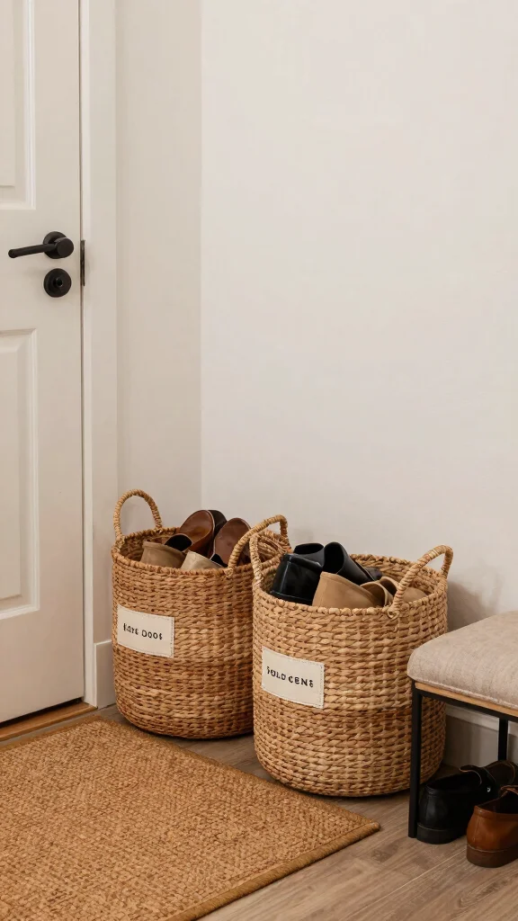 Organize shoes in stylish baskets to make your entryway look neat while adding a decorative touch.