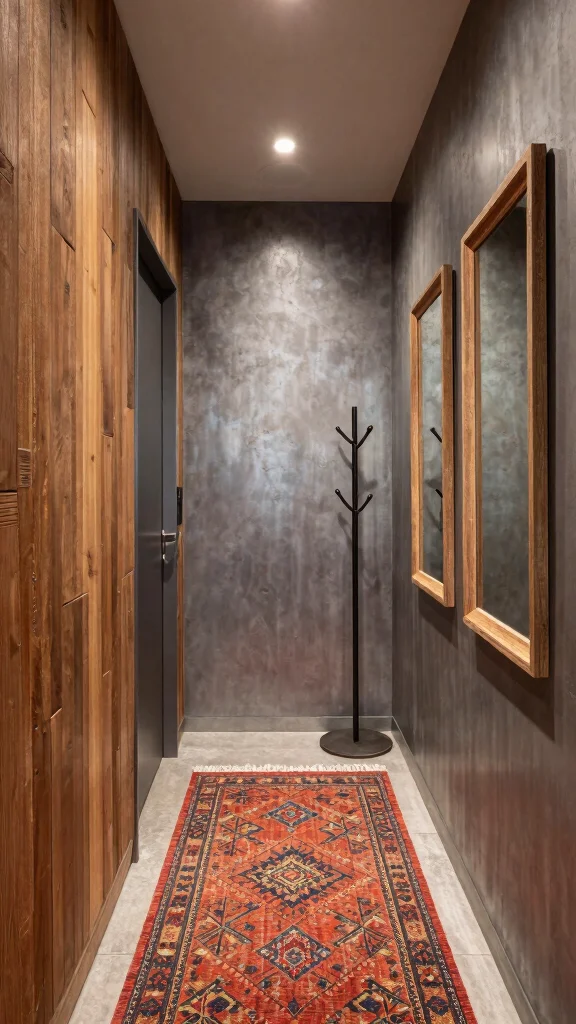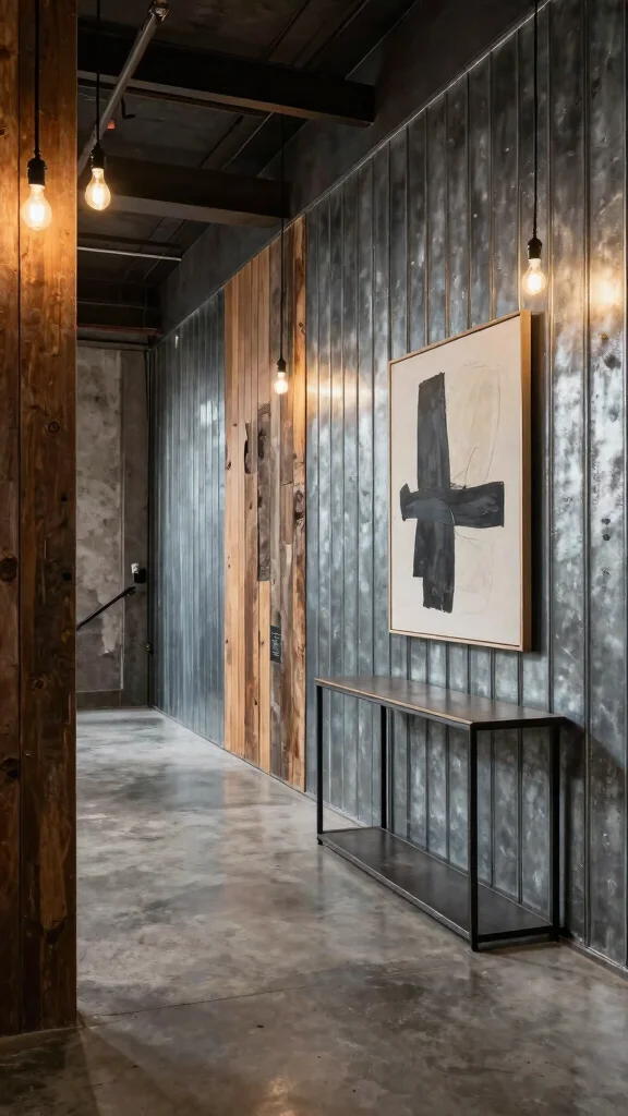 Industrial panelling provides a bold backdrop for showcasing unique decor pieces, creating a contemporary yet inviting hallway.