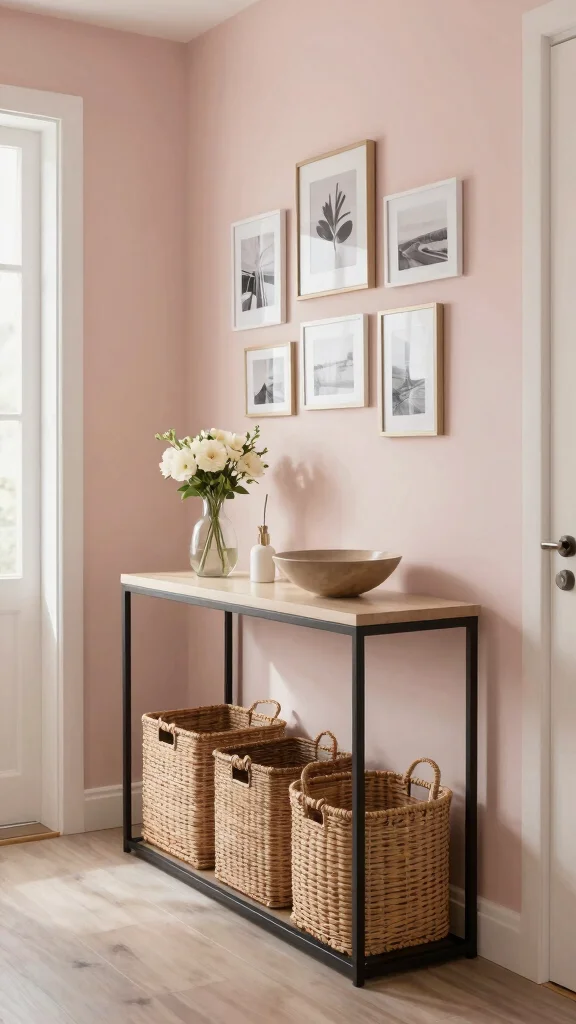 Start with a slim console table topped with decorative baskets, wall-mounted shelves for books or keepsakes, and a peg rail or hooks for coats and bags.