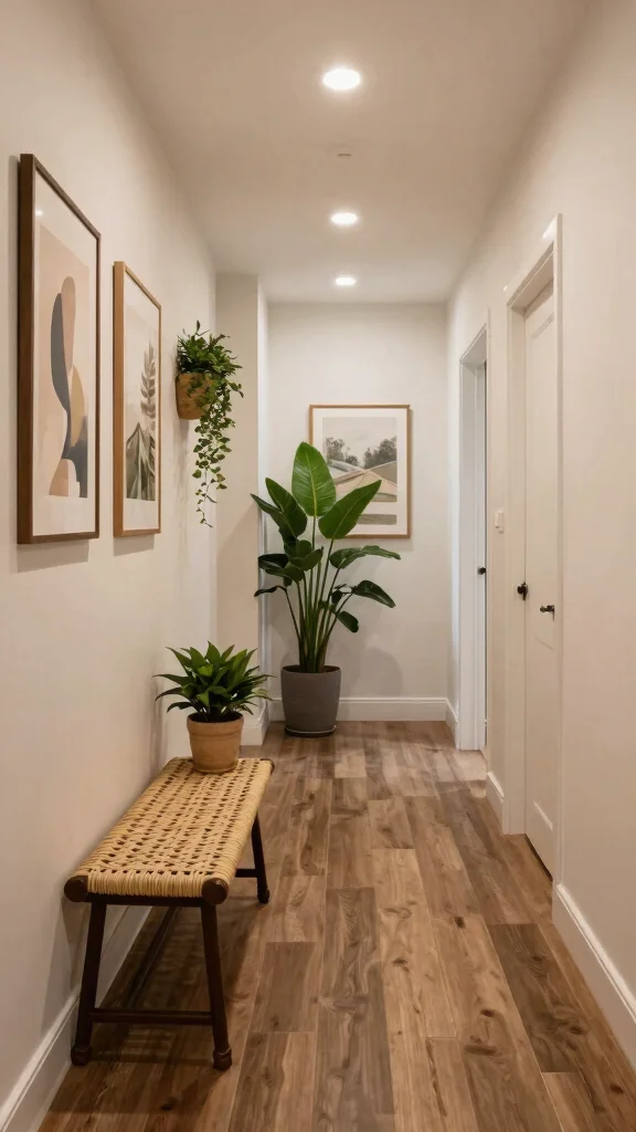 A stark hallway can feel uninspired, but introducing wall art can infuse life and personality into the space. Imagine a gallery wall featuring a blend of family photos, unique artwork, and mirrors to create a dynamic visual experience. Choose pieces that resonate with your style, whether that be vintage frames or contemporary prints, to ensure a cohesive look. If wall space is limited, leaning art on a shelf or console can provide a fresh perspective.