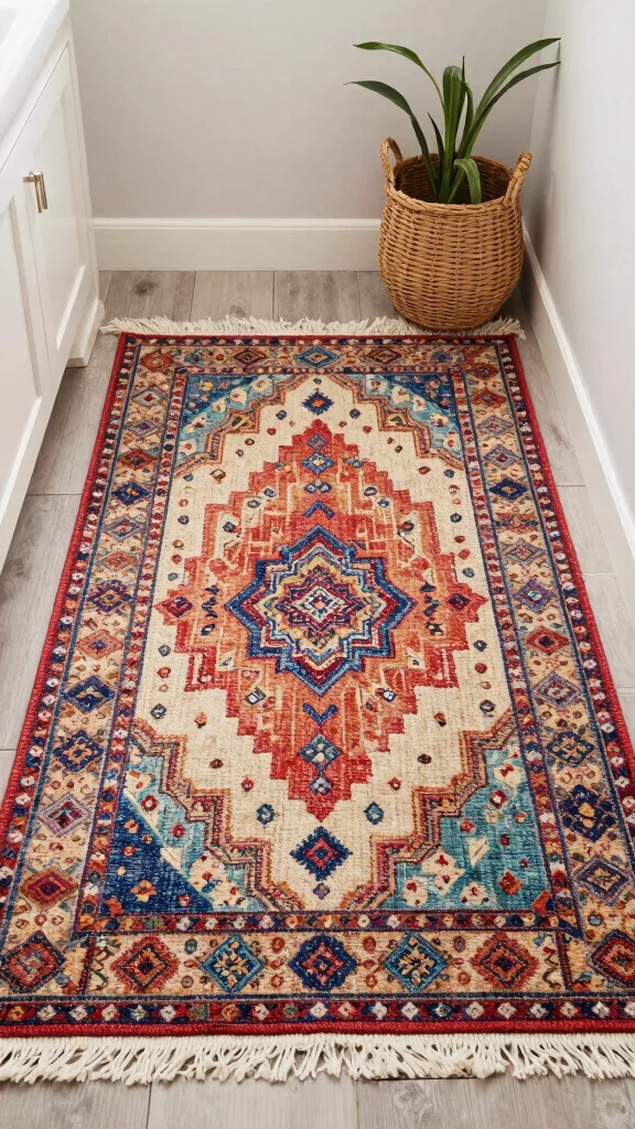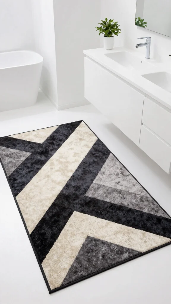 Bold geometric rugs offer a striking contrast that can dramatically elevate your bathroom’s style. Their unique patterns draw the eye, providing a modern touch that complements sleek fixtures. Imagine a geometric rug setting the stage for a contemporary bathroom with a splash of creativity.