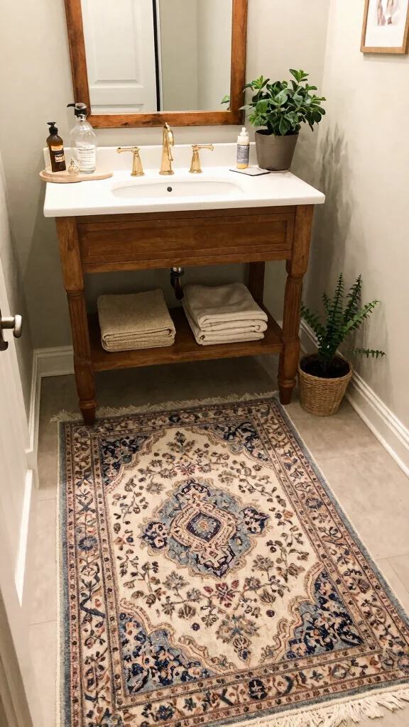 Infusing nostalgia into your bathroom is effortless with vintage-style rugs, which often feature intricate patterns and soft, faded colors. These rugs bring character and charm, telling a story that enhances the overall ambiance of the space. Visualize a vintage rug placed beside a clawfoot tub, creating a timeless appeal that welcomes you.