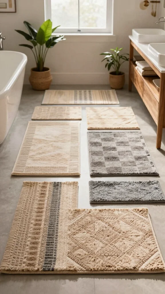 Eco-friendly bathroom decor shines with bathroom rug styles that highlight natural textures and clean lines. Think flatweave, looped tufted, or simple geometric patterns in earthy tones or soft neutrals.