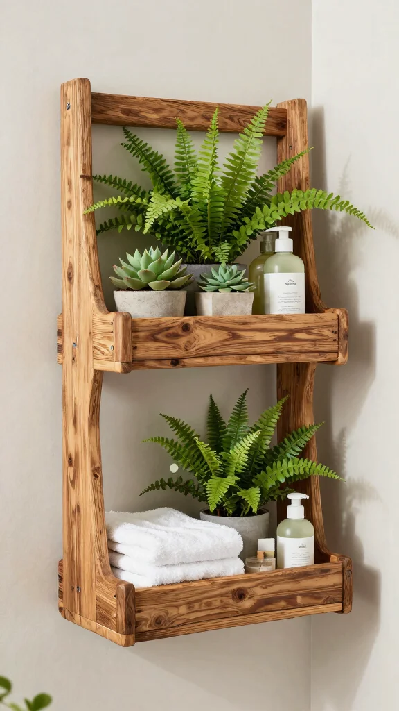 To elevate this design, consider painting the wood to complement your bathroom’s color scheme or leaving it in its natural state for an earthy appeal. Use one side for your shampoo and conditioner while leaving the other for your lovely plants. Pair it with natural bath products for a cohesive and inviting theme.