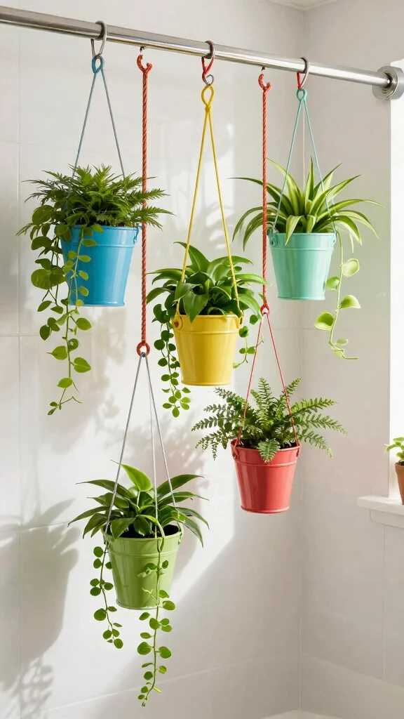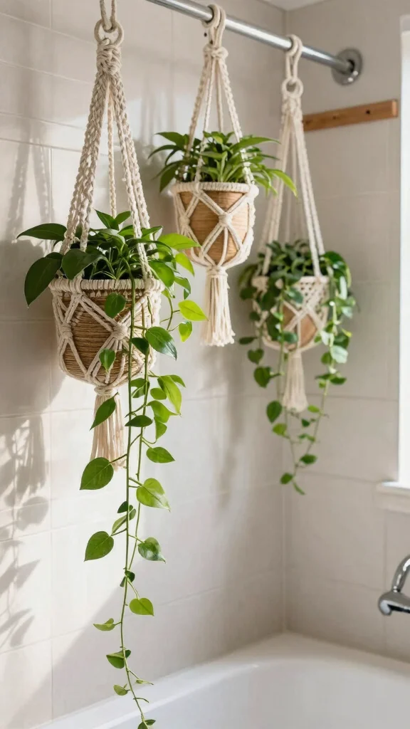 Introduce a bohemian vibe to your bathroom with hanging macramé planters, which easily attach to your shower caddy for a whimsical touch. These stylish plant holders not only save space but also create a stunning visual effect as vibrant plants dangle gracefully from above. Choose lush trailing plants like pothos or string of pearls to enhance your decor, as the intricate knots of macramé add texture and charm. Mixing various styles and colors can create a playful atmosphere that invites relaxation.