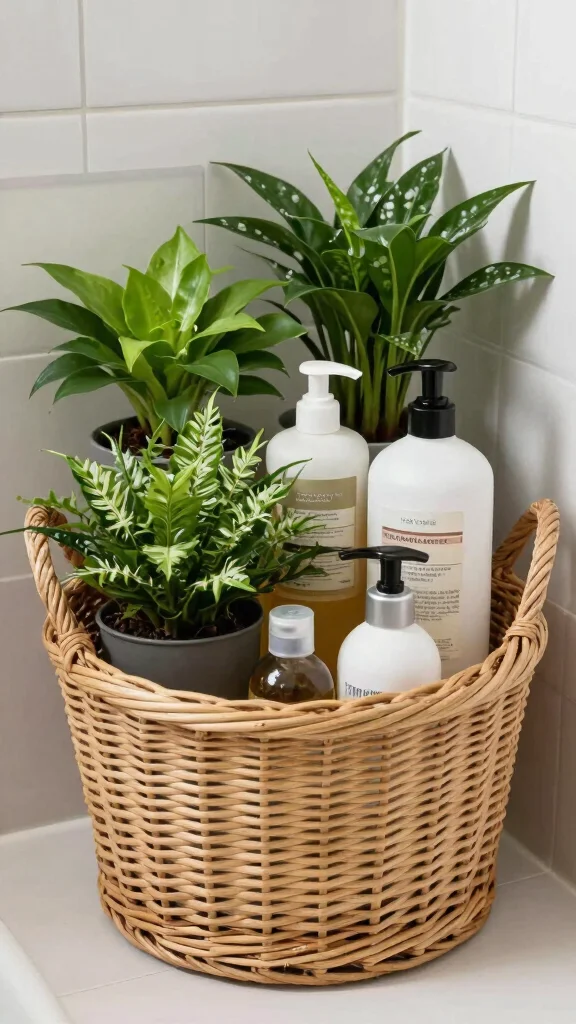 A multi-purpose shower basket can significantly tidy up your bathroom while providing an ideal home for indoor plants. Available in various materials like wicker or metal, these baskets are designed to hold multiple items. Fill one side with toiletries and the other with your favorite small plants, creating a striking contrast between vibrant greenery and earthy fibers.