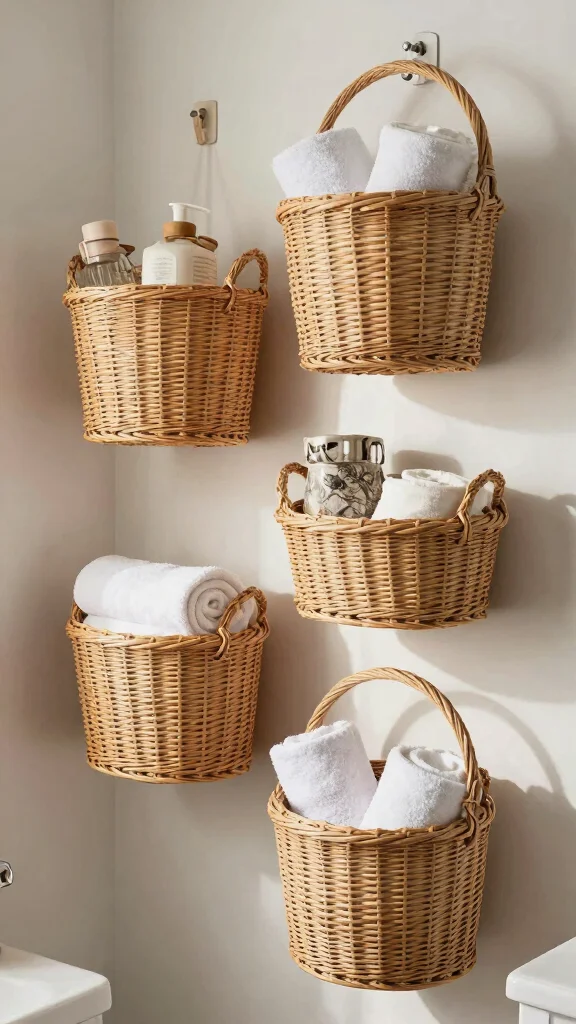 Hanging basket towel storage is a charming option that adds both texture and functionality to your bathroom. These baskets can be hung from hooks or mounted on the wall, offering a stylish way to store towels and accessories.Using materials like rattan or woven fibers introduces an organic element that enhances your decor. This method is perfect for storing rolled towels or other items while keeping them easily accessible.Consider these ideas for hanging basket storage: